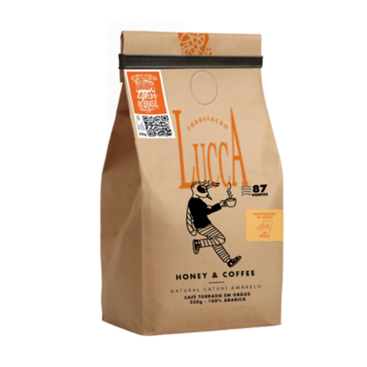 O Café Especial Torrado e Moído Honey Coffee Lucca 250 g é um microlote de altíssima qualidade, proveniente da Fazenda Honey Coffee, em São Gonçalo do Sapucaí (MG), cultivado por Alessandro Alves Hervaz. Produzido a 1 300 m de altitude com a variedade Catuaí Amarelo, esse café passa pelo cuidadoso processo natural (honey). Torrado pela equipe da Casa Lucca, resulta em uma bebida doce, equilibrada, aromática e com acidez cítrica média que valoriza o perfil do grão e a tradição brasileira