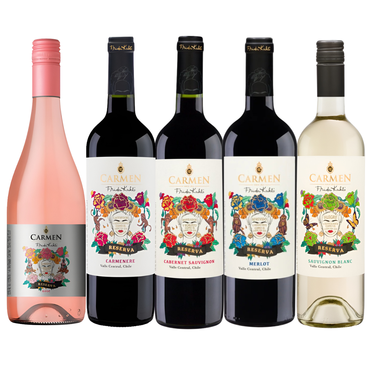 O Kit 5 Vinhos Carmen Frida Kahlo é uma homenagem à força, autenticidade e sensibilidade da icônica artista mexicana Frida Kahlo. Produzidos pela tradicional Vinícola Carmen, a mais antiga do Chile, esses rótulos unem arte, história e sabor em uma coleção única. Cada garrafa reflete um aspecto da personalidade de Frida, combinando elegância, intensidade e expressão em vinhos equilibrados e acessíveis, perfeitos para degustar, presentear ou colecionar.