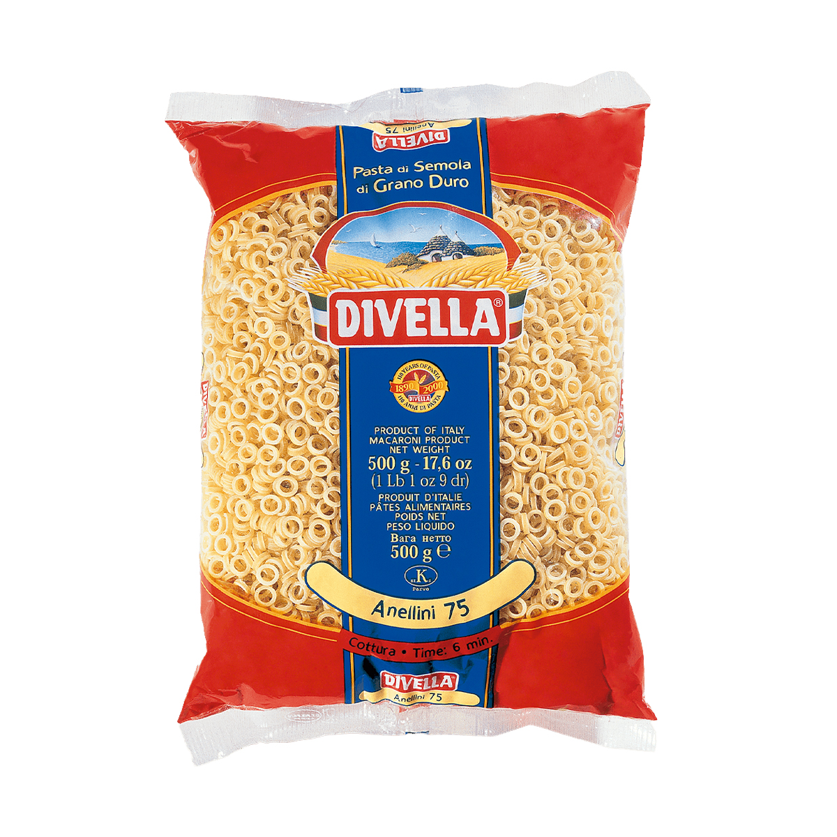 Com coloração amarelo-dourada e textura consistente após o cozimento, os anellini mantêm a firmeza e absorvem muito bem caldos e molhos, tornando cada receita mais saborosa e equilibrada. A Divella, marca italiana consagrada, garante pureza e tradição em cada embalagem.