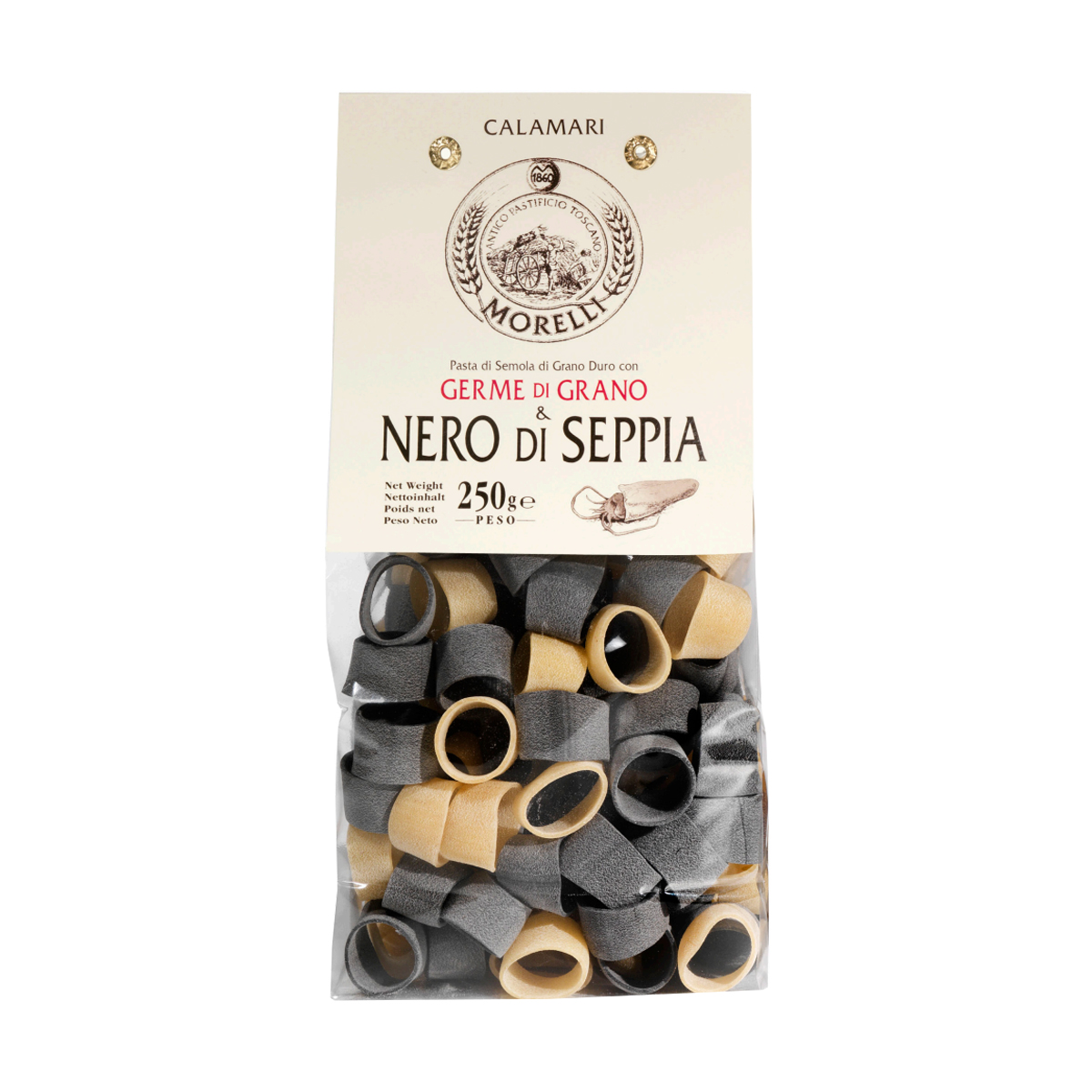 A Massa Calamari al Nero di Seppia Morelli 250g é uma especialidade italiana refinada, produzida artesanalmente com o toque exclusivo da tinta de lula, que confere à massa sua coloração escura e sabor levemente marinho. Feita pela tradicional Pastificio Morelli, conhecida desde 1860 pela excelência na fabricação de massas gourmet, esta versão destaca-se por sua textura firme e sabor intenso, ideal para preparações sofisticadas.